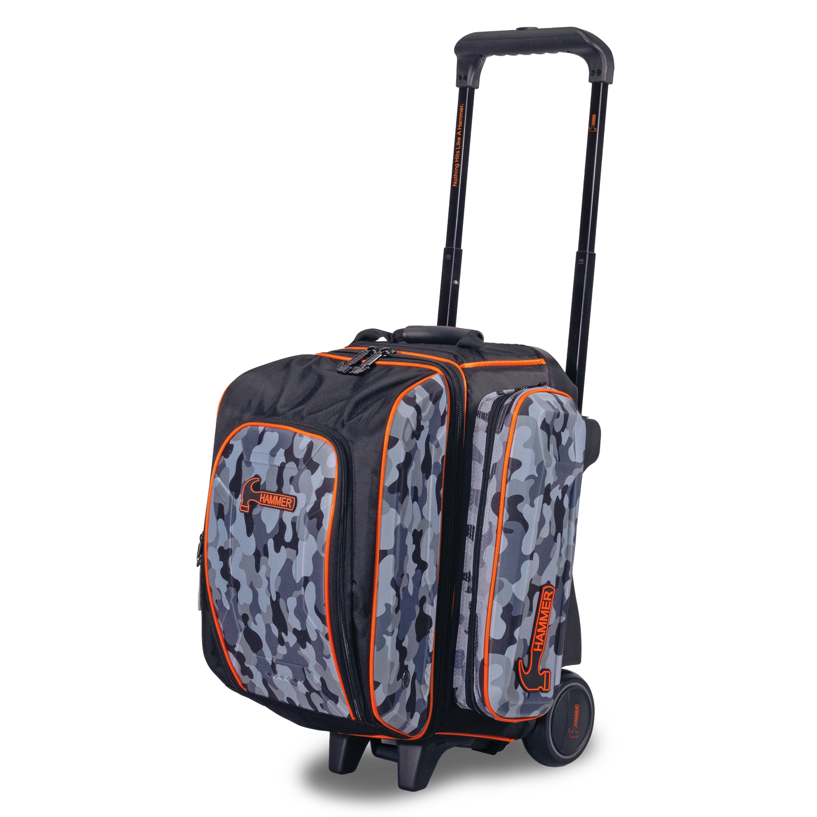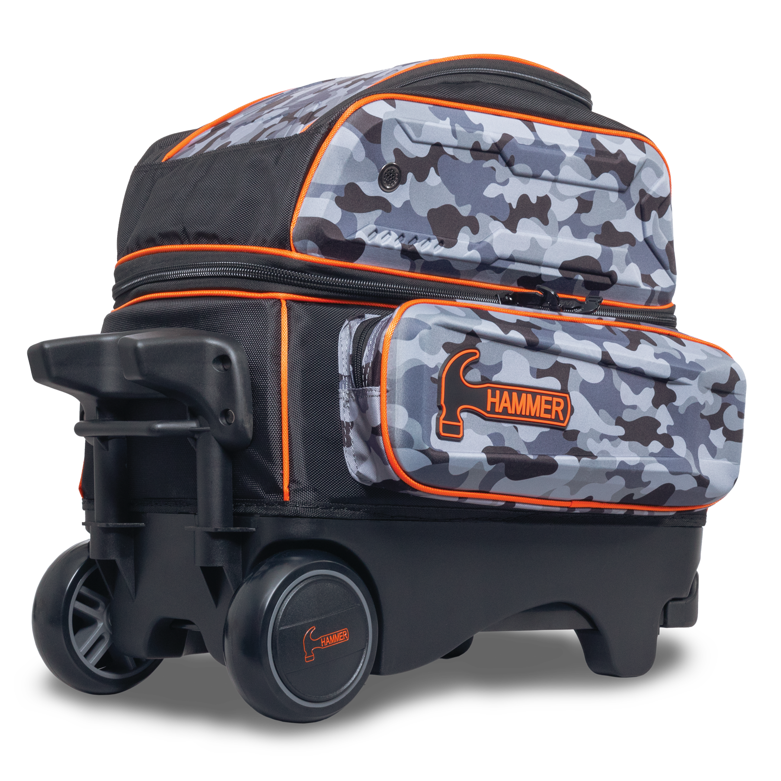 Experience top-tier quality with the Hammer Gauntlet Camo 2 Ball Double Roller Bowling Bag. This sleek 2-ball bag boasts molded insert ball holders on a premium base. Equipped with a retractable locking handle system that neatly tucks away at the bag’s edge for space-saving convenience. Enjoy a stable and smooth roll thanks to the wide 5-inch wheels.